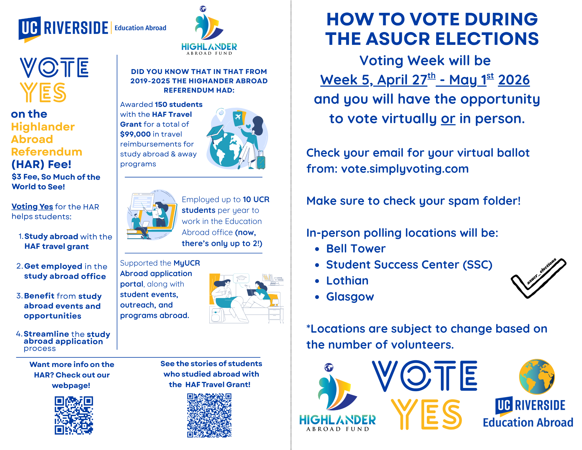 The UCR Education Abroad Office is seeking approval for renewing the Highlander Abroad Referendum (HAR) in the upcoming ASUCR Elections from April 27 to May 1, 2026.